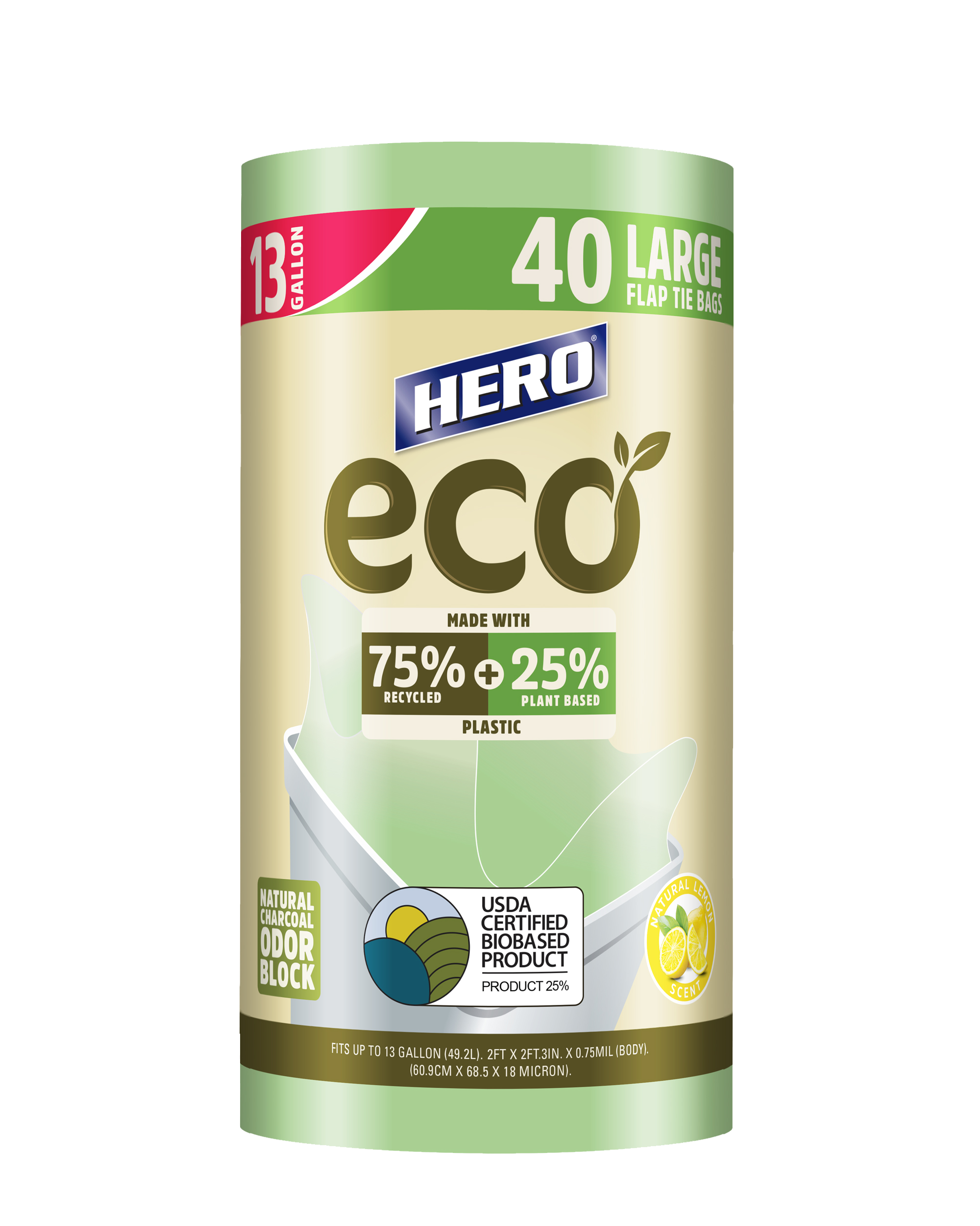 Hero Eco trash bags are made from 75% recycled and 25% Plant Based plastic. They have been independently tested and certified by the USDA Biobased program to contain minimum 25% plastic made from ethanol derived from fast growing sugar cane.